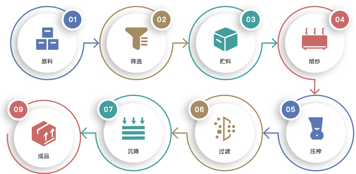 兩廠均采購(gòu)國(guó)際先進(jìn)的生產(chǎn)工藝及加工設(shè)備,引進(jìn)日本進(jìn)口的全自動(dòng)芝麻油機(jī)榨生產(chǎn)線。我們以嚴(yán)格且多重的方式進(jìn)行原料的篩選